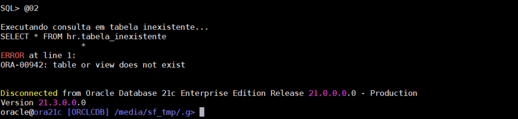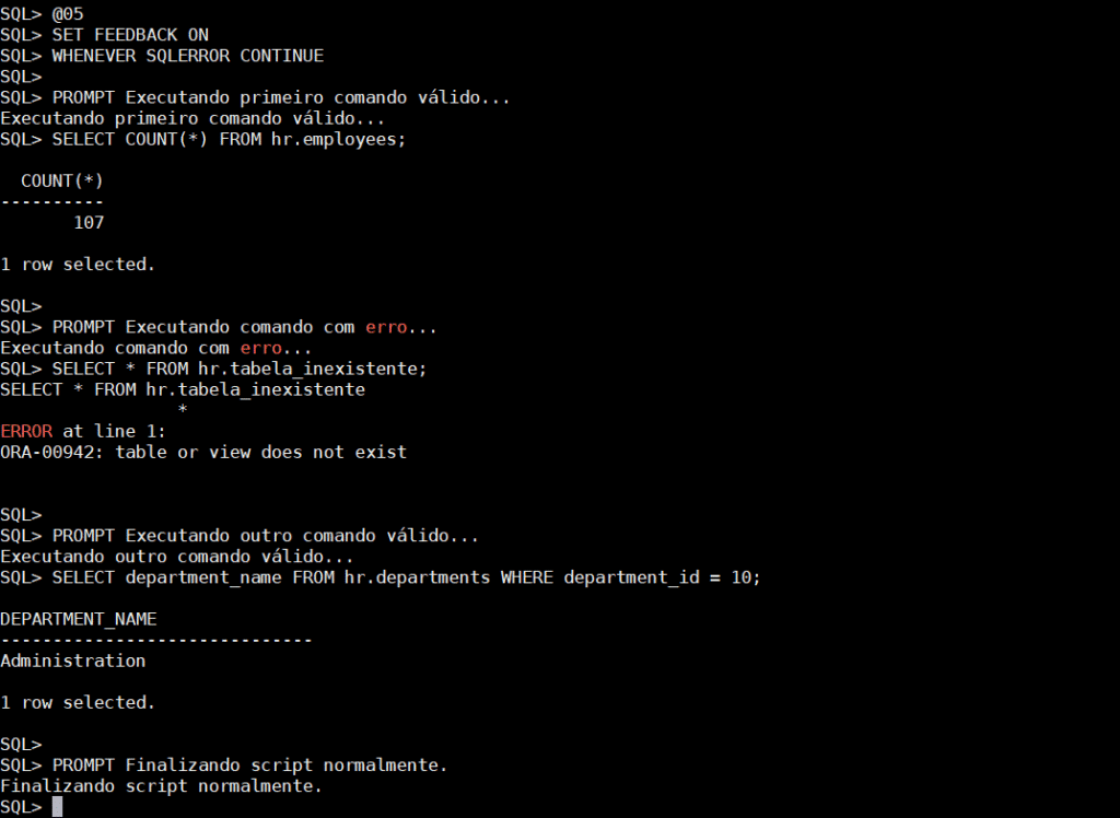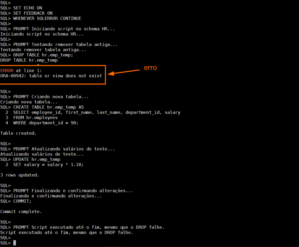 Ao rodar esse script, o SQL*Plus exibe o erro da tabela inexistente, mas continua executando até o final. Se você remover o WHENEVER SQLERROR CONTINUE, o script vai parar imediatamente após o erro.