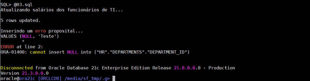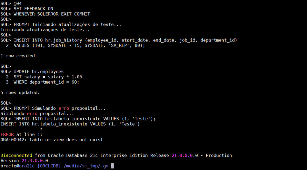 As duas primeiras operações (INSERT e UPDATE) são confirmadas. O erro no terceiro comando faz o Oracle encerrar a sessão, mas o EXIT COMMIT garante que tudo que veio antes seja confirmado.